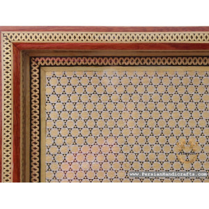 Khatamkari (Persian Marquetry) is the incrustation pattern, generally star-shaped, with thin sticks of beech or Ziziphus wood, brass for golden parts and camel bones for white parts.