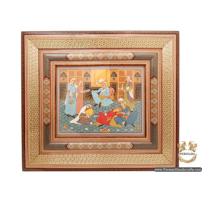 This miniature painting shows the Persian banquet of food & wine handpainted w shiny colors for live feeling on the wall. The painting is framed with premium quality Khatamkari with 5 different geometrical patterns.