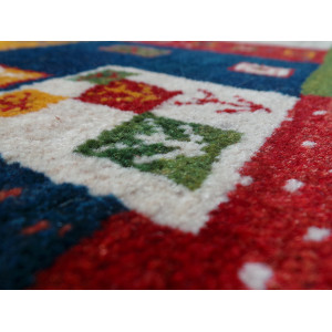 A Gabbeh a hand-woven pile rug of coarse quality and medium size (90 x 150 cm or larger) characterized by an abstract design that relies upon open fields of color and a playfulness with geometry. This type of rug is popular among the populations of the Zagros Mountains of Iran, including Kurdish, Luri and Qashqai people. The Gabbeh is usually crafted by women. Gabbeh carpets are much thicker and coarser than other Persian carpets; sometimes it is as much as one inch in depth. In fact, it is more of a variety of kilim than carpet. The word 'Gabbeh' comes from the Persian meaning raw, natural, uncut. This is a rough and primitive carpet. Gabbeh patterns are of a very basic kind with only a limited number of decorative, mostly rectangular objects resembling mainly animals. In Gabbeh usually bright colors, such as yellow and red, are used. Although large fields of solid color are used in Gabbeh designs, the color is variegated (the color varies throughout the rug). Gabbehs are made of natural, handspun wool yarn and all the colors are created with natural plant dye. Due to its relative ease of production (less precise pattern, small number of knots per square centimeter, etc.) a Gabbe is one of the less expensive varieties of Persian carpet.