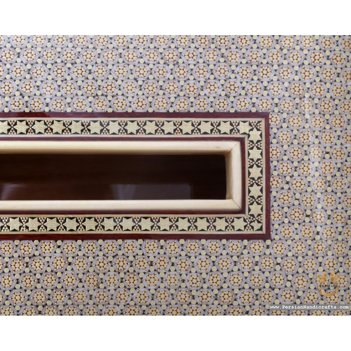 Khatamkari the Persian Style Marquetry is the incrustation pattern, generally star-shaped, with thin sticks of beech or Ziziphus wood, brass for golden parts and camel bones for white parts.